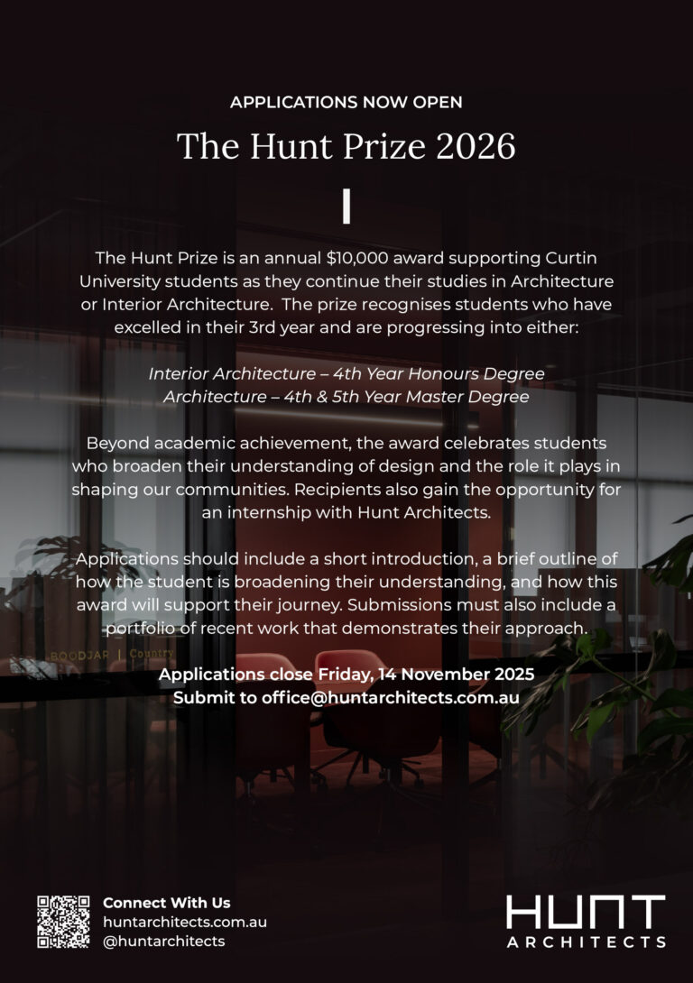 Interior Architecture students eligible for this prize must commit to undertaking 4th year of the Interior Architecture honours course at Curtin University. The total prize of $10,000 will be paid in two instalments. $5,000 will be paid at the commencement of your 4th year of study and the remaining $5,000 on completion of the honours degree.